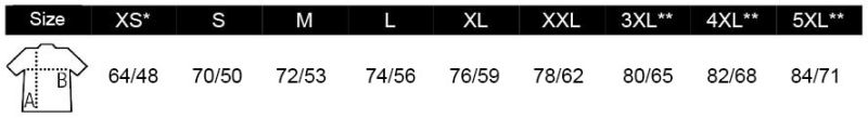 Größen: XS* – S – M – L – XL – XXL – 3XL – 4XL* – 5XL** in ausgewählten Farben erhältlich