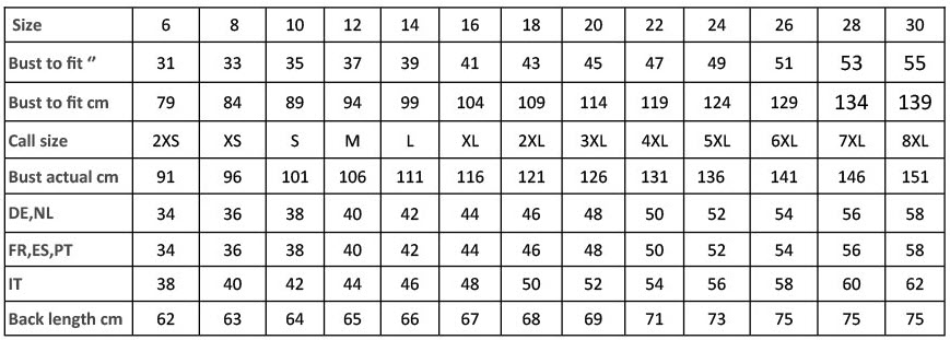 | Chest (to fit) | 31 | 33 | 35 | 37 | 39 | 41 | 43 | 45 | 47 | 49 | 51 | 53 | 55 |