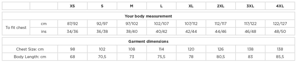 | XS | S | M | L | XL | 2XL | 3XL | 4XL | |