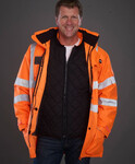 Wasserdicht, verstellbare Kapuze, elastische Bündchen an Arm- und Bundabschluss, Kombi-Verschluss mit durchgehendem Reissverschluss und Druckknöpfen, durchgehende Windschutzblende, 2 Seitentaschen mit Klappen, Innentasche, aufgesetzte Brusttasche, Nähte versiegelt, zertifiziert nach EN ISO 20471 Klasse 3 und EN 343, garantierte Reflektionseigenschaft gemäss EN-Norm für 25 Waschgänge, 40° waschbar.